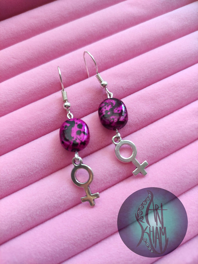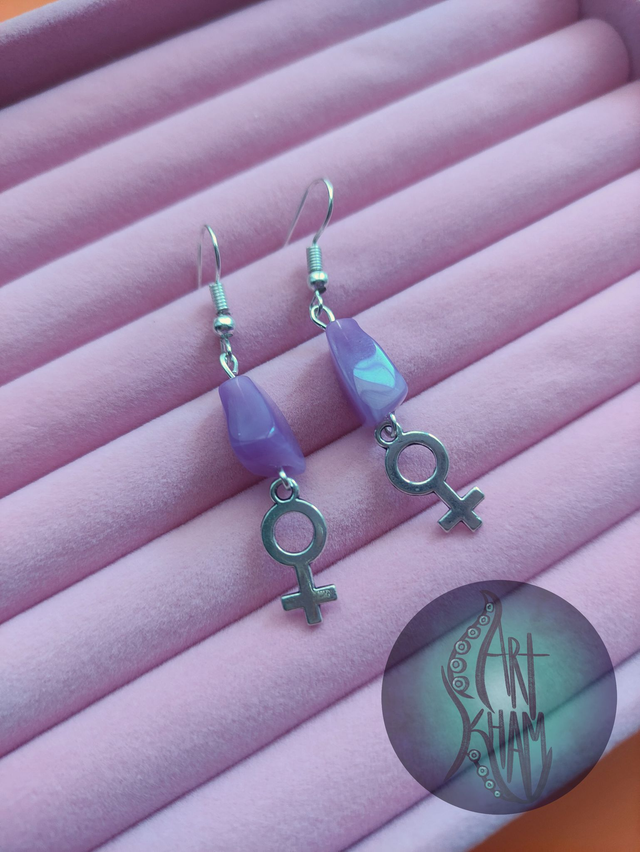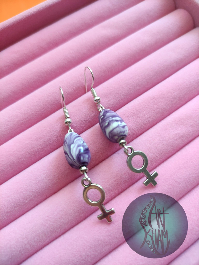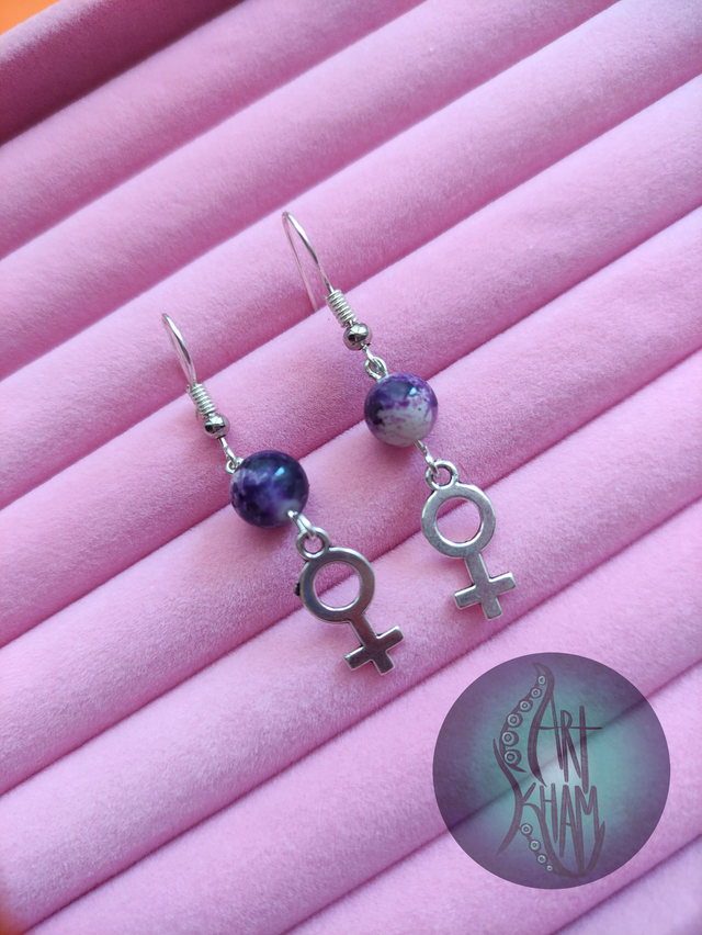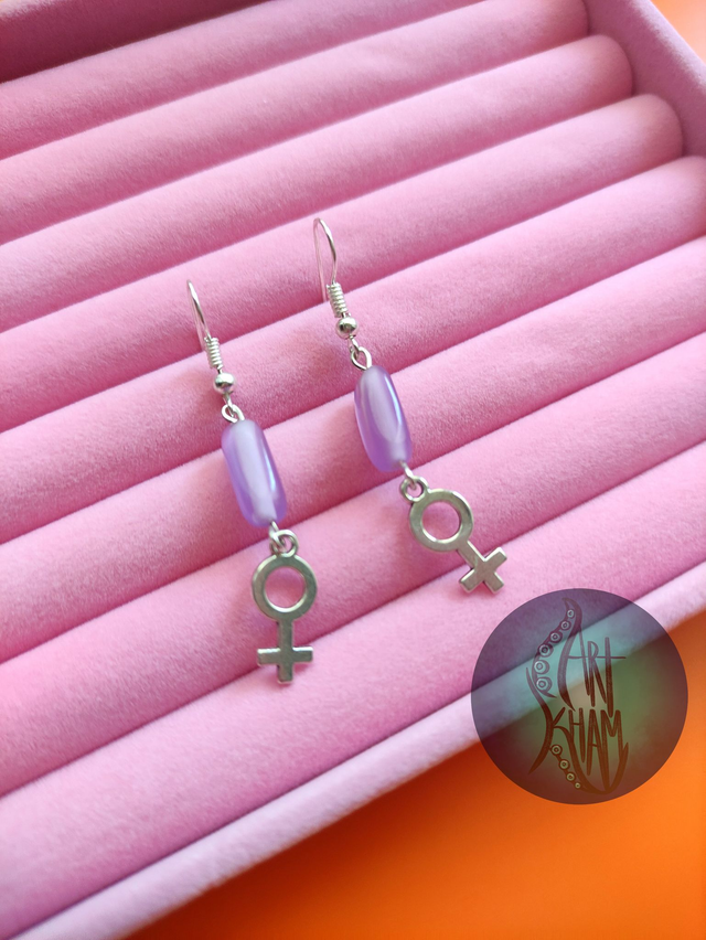 Pendientes con el símbolo femenino y piedras decorativas en bonitos colores morados y violetas.